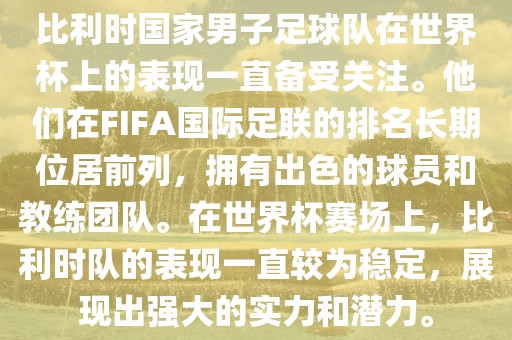比利时国家男子足球队在世界杯上是一支备受关注的球队,他们拥有强大的实力和潜力,始终在比赛中展现出出色的表现,他们仍将是世界杯赛场上的重要竞争者之一。