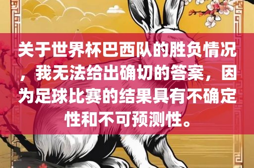 关于世界杯巴西队的胜负情况无法预测,因为足球比赛的结果受到多种因素的影响,包括球员状态、战术布置、对手实力等。每一场比赛都是独特的,充满了不确定性和变数。无法给出确切的胜负预测。