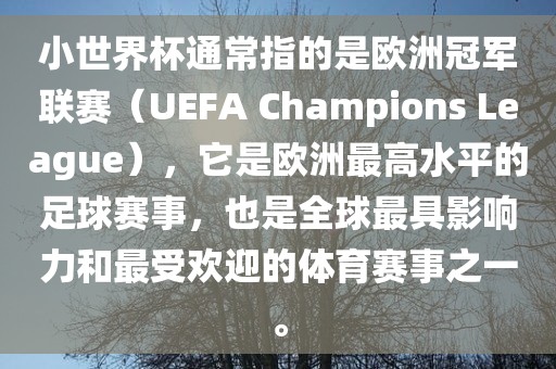 小世界杯通常指的是欧洲冠军联赛(UEFA Champions League),它是欧洲最高水平的足球赛事,也是全球最具影响力和最受欢迎的体育赛事之一。