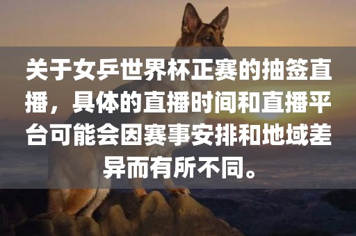 关于女乒世界杯正赛的抽签直播,赛事安排和地域差异可能会影响具体的直播时间和平台。观众需关注赛事官方消息以获取准确的直播信息。此次直播将呈现女乒选手们的激烈竞争和精彩瞬间,引起广大球迷的关注和期待。