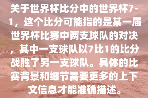 关于世界杯比分中的世界杯7-1,这个比分可能指的是某一届世界杯比赛中两支球队的对决,其中一支球队以7比1的比分战胜了另一支球队。具体的比赛背景和细节需要更多的上下文信息才能准确描述。