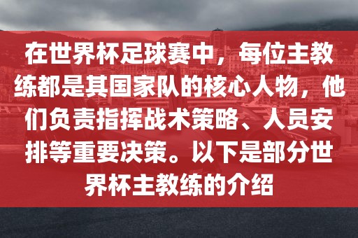 在世界杯足球赛中,每位主教练都是其国家队的核心人物,他们负责指挥战术策略、人员安排等重要决策。以下是部分世界杯主教练的介绍