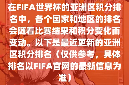 在FIFA世界杯的亚洲区积分排名中,各个国家和地区的排名会随着比赛结果和积分变化而变动。以下是最近更新的亚洲区积分排名(仅供参考,具体排名以FIFA官网的最新信息为准)