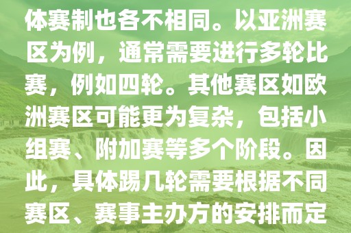 世界杯预选赛分为多个赛区,具体赛制也各不相同。以亚洲赛区为例,通常需要进行多轮比赛,例如四轮。其他赛区如欧洲赛区可能更为复杂,包括小组赛、附加赛等多个阶段。因此,具体踢几轮需要根据不同赛区、赛事主办方的安排而定。