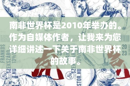 南非世界杯是2010年举办的。作为自媒体作者,让我来为您详细讲述一下关于南非世界杯的故事。