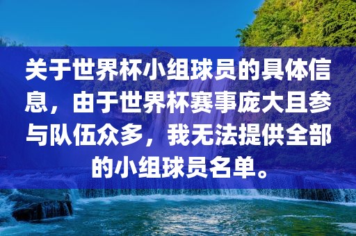 摘要:由于世界杯赛事规模庞大,参与队伍众多,无法提供全部的小组球员名单。关于世界杯小组球员的具体信息,将在后续报道中陆续更新。请持续关注以获取最新动态。