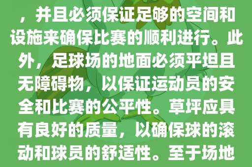 摘要:世界杯足球赛的场地必须符合国际足球联合会规定的足球场尺寸标准,通常为长105米,宽68米,并需确保平坦无障碍物的地面以保证运动员的安全和比赛的公平性。草坪质量良好以确保球的滚动和球员的舒适性。场地通常在主办国的足球场馆和城市中选择,以容纳大量观众并满足赛事组织的需求。